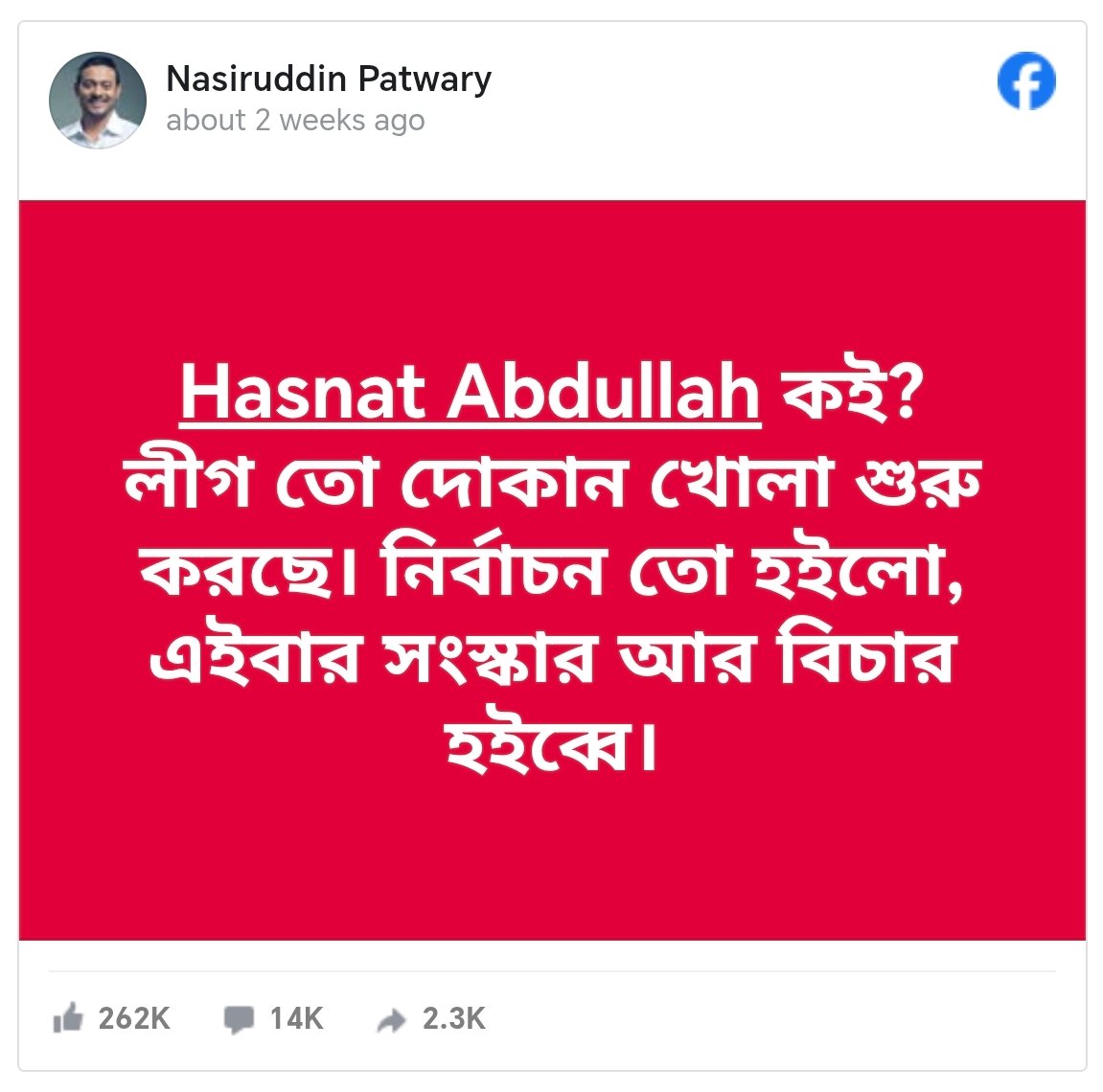 নাসীরুদ্দীন পাটওয়ারী লিখেছেন, ‘হাসনাত আব্দুল্লাহ কই? লীগ তো দোকান খোলা শুরু করছে। নির্বাচন তো হইলো, এইবার সংস্কার আর বিচার হইব্বে।’